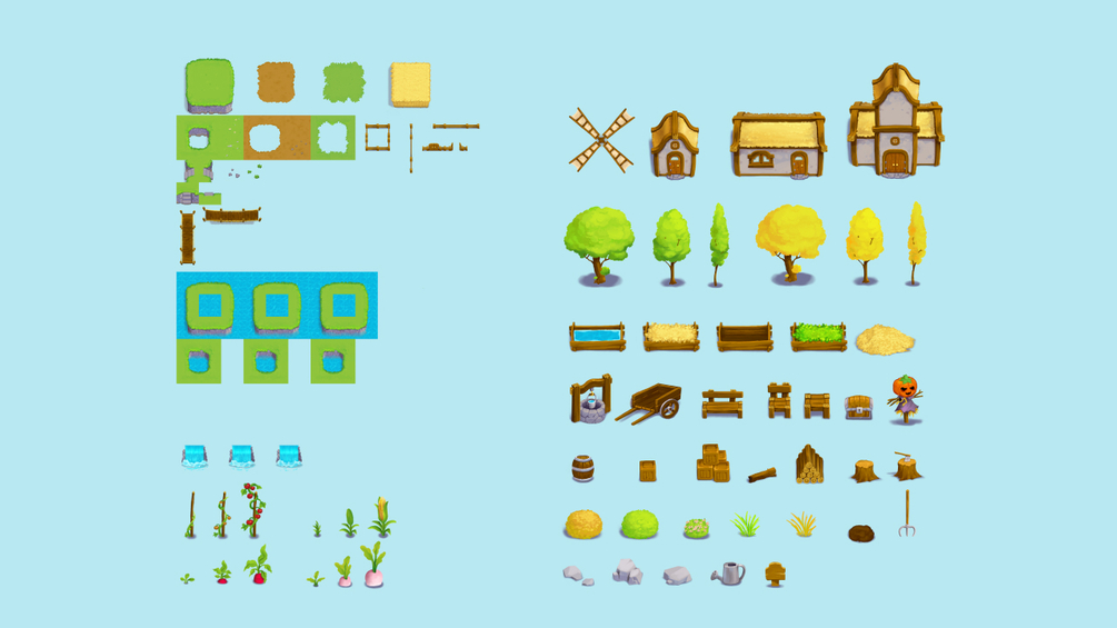 A complete top-down tileset for crafting cozy farm scenes!