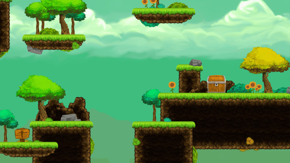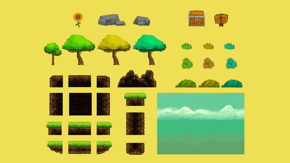 - 21 items and objects (sunflower, rock x3, chest, tree x6, bush x3, sign board)