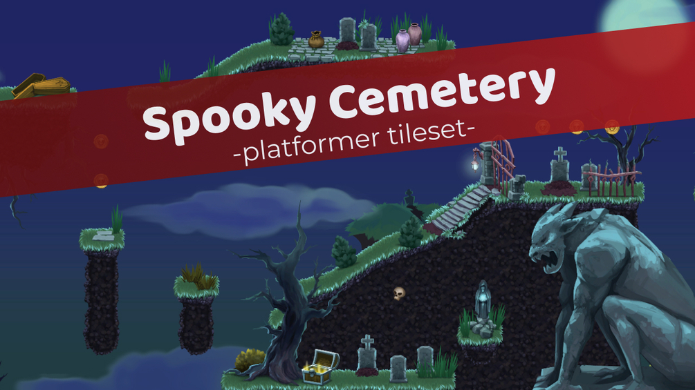 A complete cemetery tileset that includes tiles, objects and background elements to create a spooky environment.