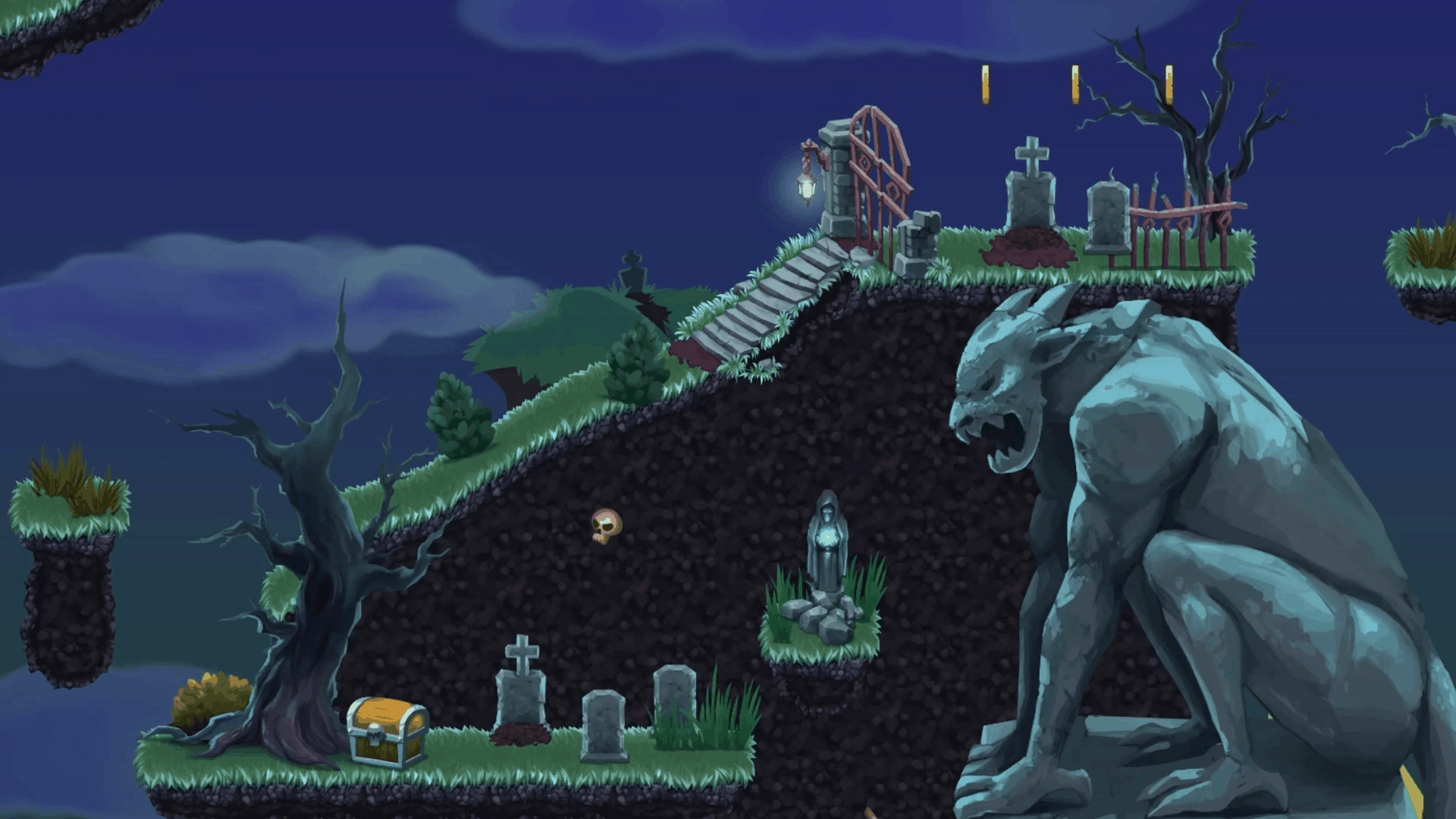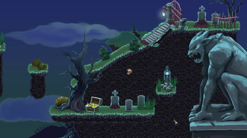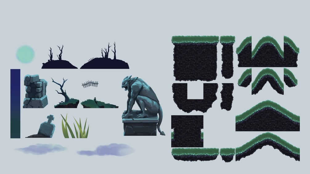 A complete cemetery tileset that includes tiles, objects and background elements to create a spooky environment.