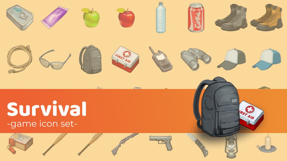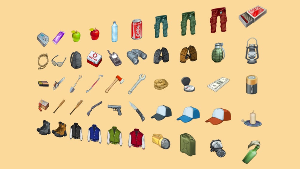 Aid kit, apple green, apple red, axe, backpack, baseball bat, baseball bat with nails, battery, beverage can, binoculars, boots, boots leather, candle, canned tuna, cap black, cap blue, cap red, cargo pants blue, cargo pants green, cargo pants red, chainsaw, chocolate bar, coins, compass, crowbar, flashlight, fuel can, gloves, gloves leather, grenade, handy, jacket black, jacket blue, jacket green, jacket red, lantern, matches, molotov, money, pistol, pistol ammo, pocket knife, respirator mask, rope, shotgun, shotgun shell box, shovel, sunglasses, water bottle, wrench.